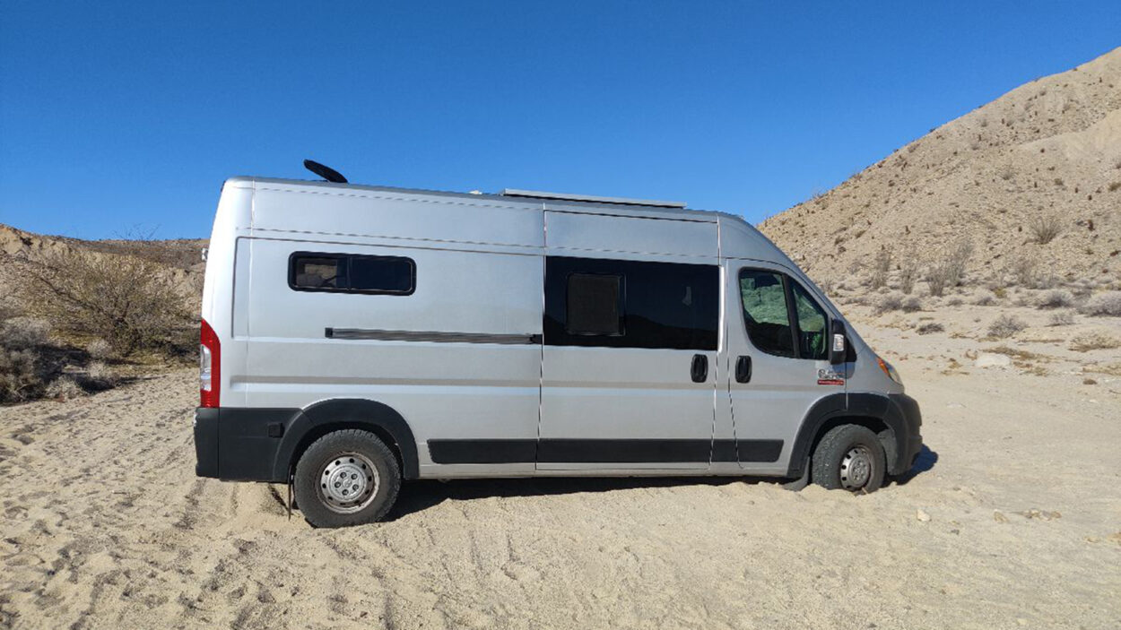Van stuck offroad recovery in California